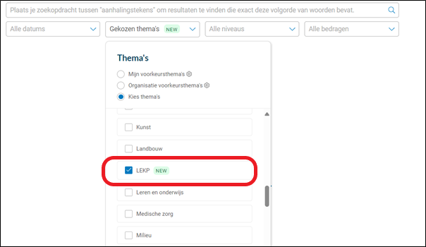 Tip: Voeg de LEKP-filter toe aan je voorkeursthema’s in Subsidiemanager om geen enkele nieuwe subsidie te missen.