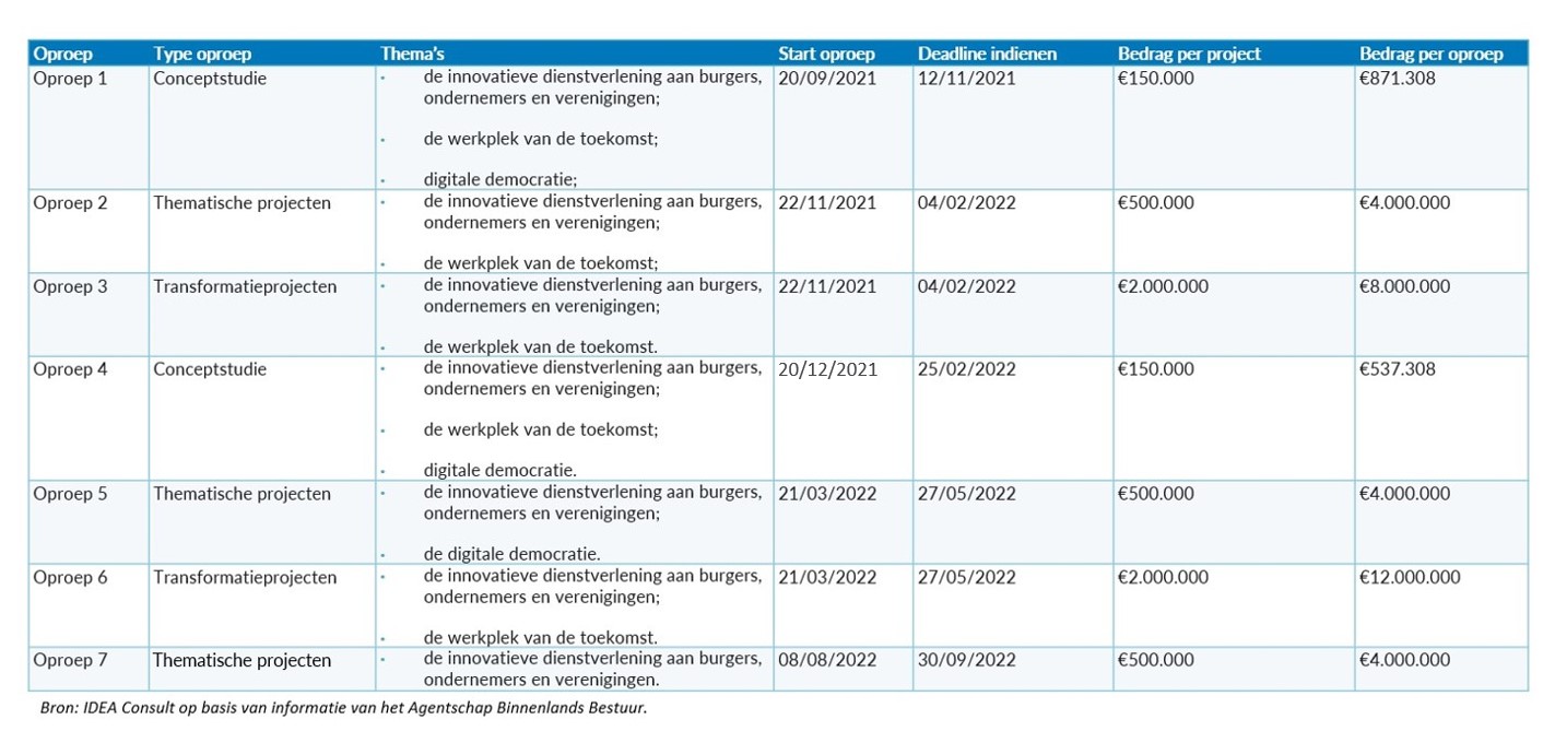- Oproepen voor Transformatieprojecten: dit type van oproepen mikt op transformatieprojecten waarbij simultaan grootschalige veranderingen worden doorgevoerd aan de werkprocessen, de structuur, de ICT-systemen en datahuishouding van een omvattend aantal processen.