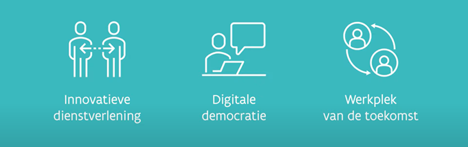 - Digitale democratie. De focus ligt hier op innovatieve trajecten die vernieuwende praktijken neerzetten op het vlak van e-participatie. Het begrip “participatie” wordt daarbij breed geïnterpreteerd en kan gaan om informeren, raadplegen, adviseren, coproduceren, en (mee)beslissen. Ook de besturende of (management)processen vallen binnen dit thema.