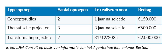 De oproepen vindt u uiteraard terug in de Subsidiemanager, maar we vatten de belangrijkste zaken voor u samen in onderstaande tabel: