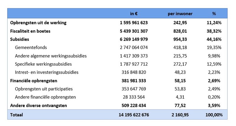 Over het boekjaar 2019 hebben alle Vlaamse gemeenten en OCMW's samen, zoals geïllustreerd in tabel 1, voor een totaalbedrag van ruim 6,2 miljard euro subsidies ontvangen of gemiddeld 954 euro per inwoner. Subsidies zijn hiermee de belangrijkste inkomstenbron voor de Vlaamse lokale besturen (44%), belangrijker zelfs dan hun fiscale ontvangsten (38%).