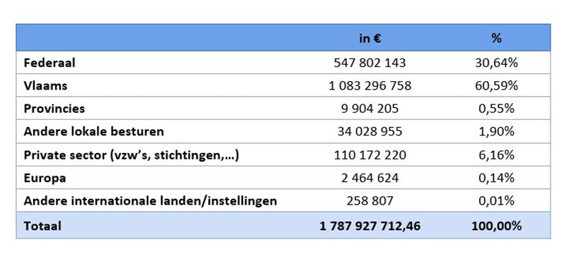 Als we even dieper inzoomen op de specifieke werkingssubsidies dan stellen we vast (tabel 2) dat ruim 60% van deze subsidies afkomstig zijn van de Vlaamse overheid, goed voor een totaalbedrag van ongeveer 1 miljard euro. Hierbij valt op dat de Vlaamse lokale besturen op heden weinig middelen rechtstreeks halen vanuit Europa (soms wel indirect via de Vlaamse overheid zoals bijvoorbeeld bij ESF-projecten). Mogelijks liggen er hier nog wel wat opportuniteiten voor de Vlaamse lokale besturen.