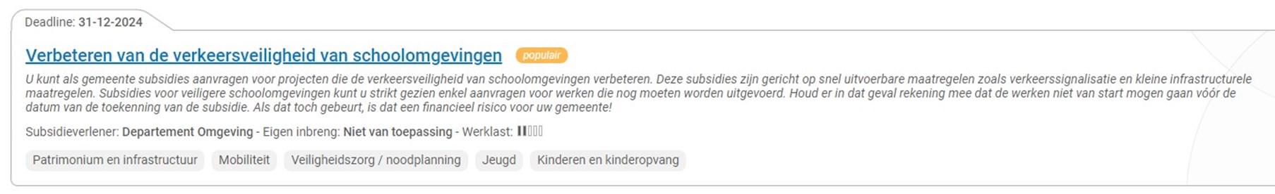 Subsidies voor veiligere schoolomgevingen kunt u strikt gezien enkel aanvragen voor werken die nog moeten worden uitgevoerd. Houd er in dat geval rekening mee dat de werken niet van start mogen gaan vóór de datum van de toekenning van de subsidie. Als dat toch gebeurt, is dat een financieel risico voor uw gemeente.