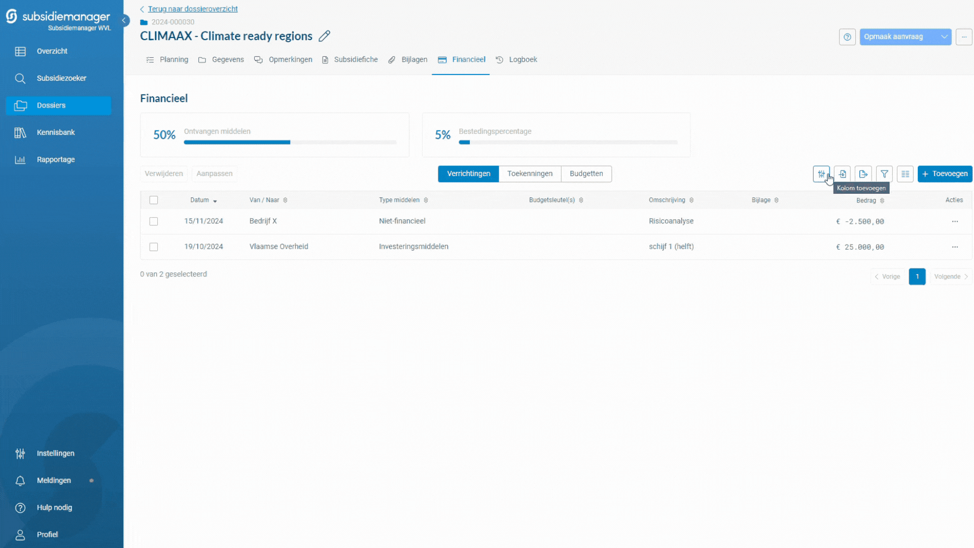 In het financiële luik van de dossieropvolging is het nu mogelijk om tot drie extra vrije kolommen toe te voegen aan uw verrichtingen, toekenningen en budgetten. Dit biedt gebruikers meer flexibiliteit om essentiële aanvullende informatie op te slaan en te beheren die van belang is voor nauwkeurige en volledige rapportages.