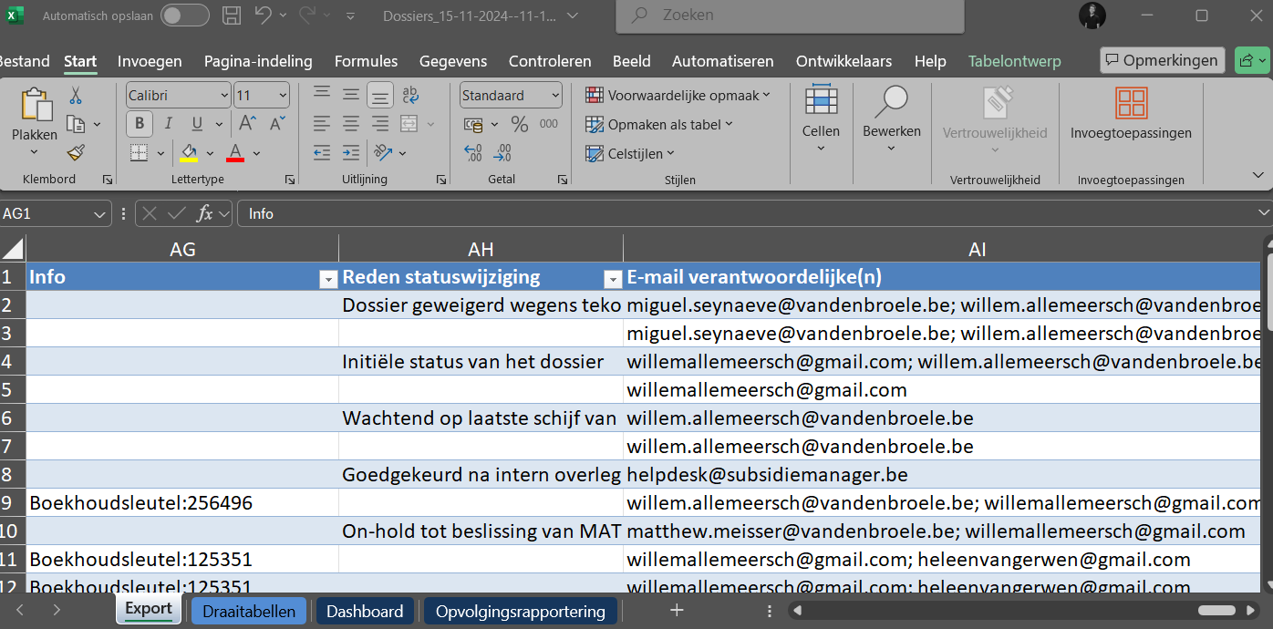 De e-mailadressen van de verantwoordelijken van een dossier: Met deze kolom kunt u direct zien wie de contactpersonen zijn binnen een dossier. Onder meer voor organisaties die deze export gebruiken voor PowerBI kan dit interessant zijn om een directe link te leggen naar de specifieke verantwoordelijken.