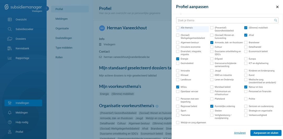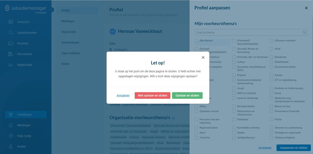 Alle instellingen moeten opgeslagen worden door te klikken op ‘aanpassen en sluiten’. Voorheen werden aanpassingen opgeslagen zonder deze handeling uit te voeren en vaak buiten uw wil door verkeerd te klikken. Klikt u (per ongeluk) weg zonder op te slaan? Dan krijgt u vanaf nu een pop-up met de waarschuwing om wijzigingen al dan niet op te slaan.
