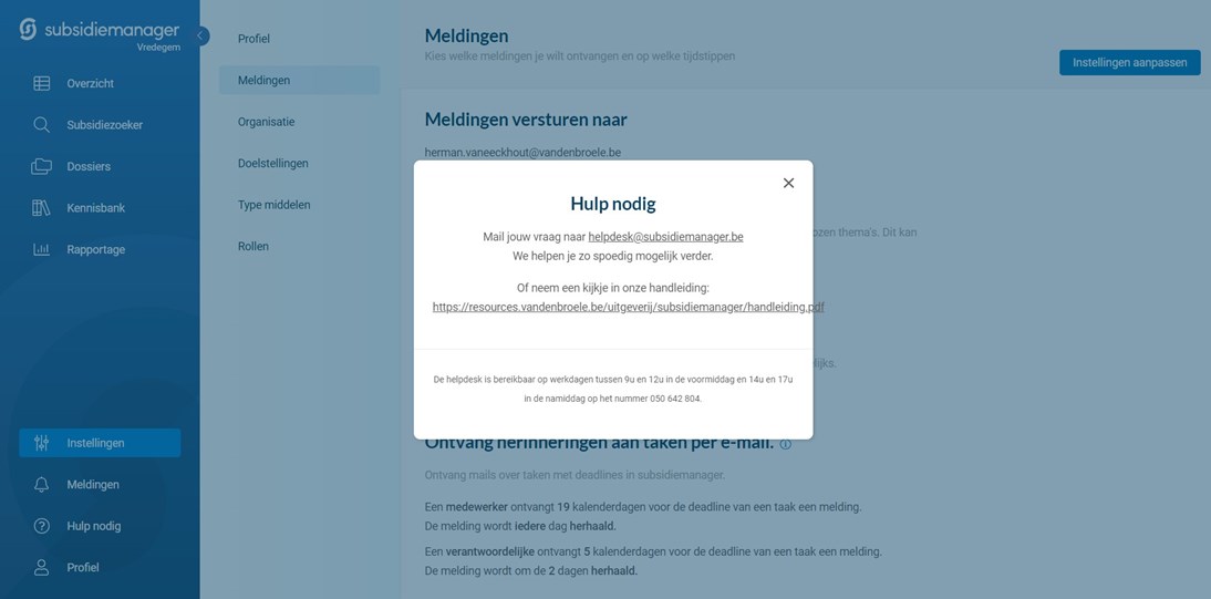 Bent u even de weg kwijt in Subsidiemanager? Klik op ‘hulp nodig’ en raadpleeg meteen de handleiding. Vindt u niet wat u zoekt? Ook de helpdesk is uiteraard nooit veraf.