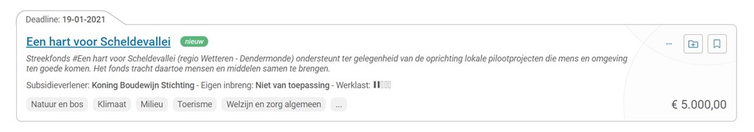 Nieuwe subsidies zijn makkelijk te herkennen in de zoeker door de groene tag 'nieuw'. Filter op ‘nieuwste’ en ze verschijnen voor u bovenaan. Populaire subsidies binnen lokale besturen worden voorzien van een gele tag ‘populair’. Zo weet u meteen wat speelt in het subsidielandschap.
