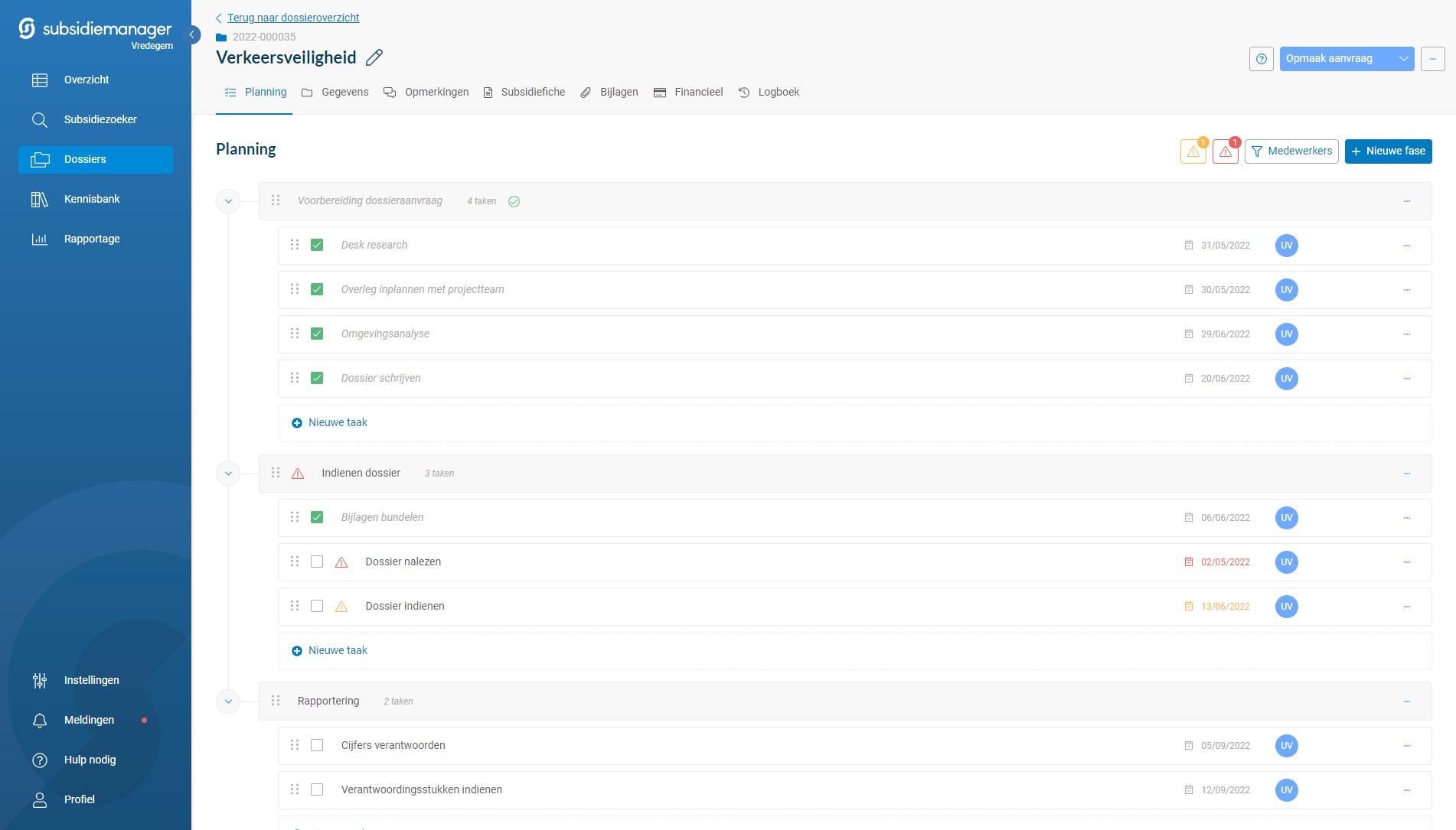 Subsidiedossiers opvolgen wordt overzichtelijker dan ooit door middel van een gloednieuwe planning met hoofdfasen en subtaken. Bundel uw taken onder de verschillende fasen die uw dossier doorloopt. Taken zullen overigens met één klik kunnen toegevoegd worden aan de Outlook-agenda.