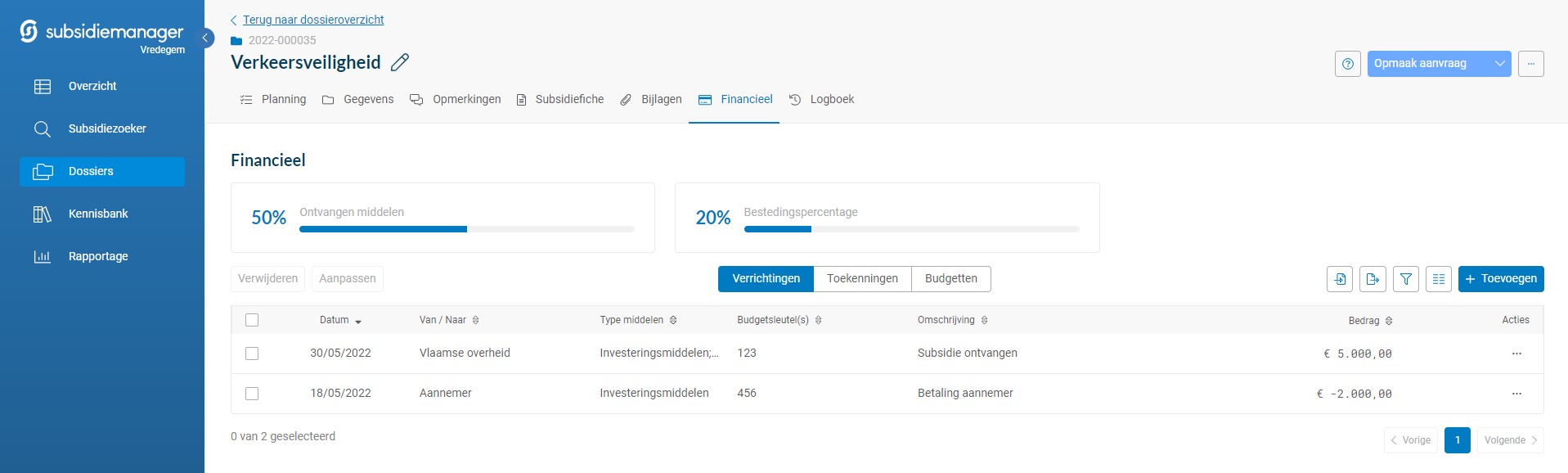 Financiële gegevens per subsidiedossier op een overzichtelijke manier bijhouden wordt een fluitje van een cent. Subsidiemanager presenteert u een volledig nieuw scherm met een unieke inkijk in de cijfergegevens van uw project. Budgetten, toekenningen en verrichtingen, zowel inkomsten als uitgaven, kunnen nauwgezet opgevolgd worden. Om het u makkelijk te maken wordt het mogelijk om deze gegevens in bulk te importeren en exporteren.