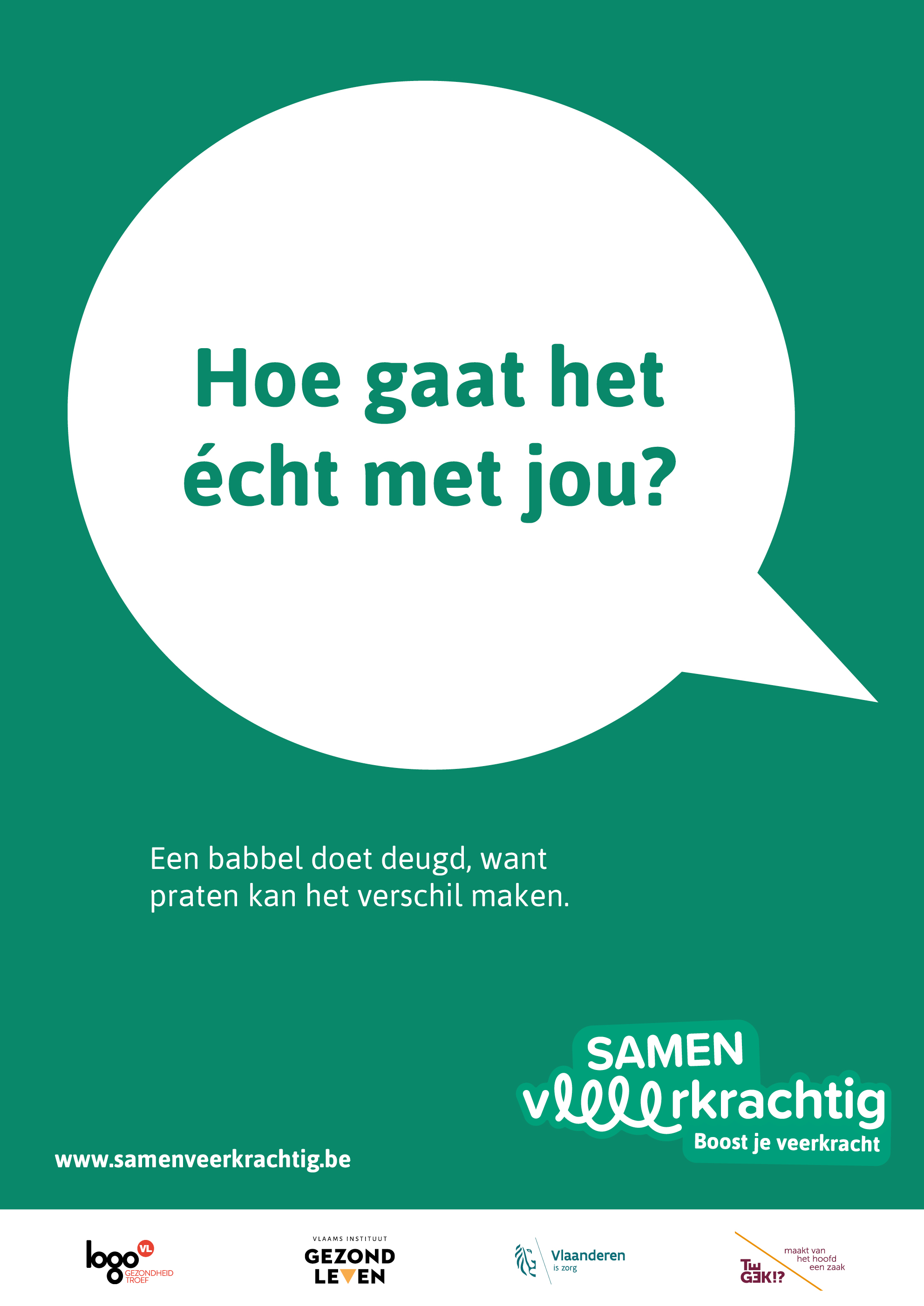 Dit jaar staan ontmoeting en sociale verbondenheid centraal. Na al die maanden coronapandemie hebben we allemaal ondervonden dat we contact met anderen nodig hebben. Een schouder om op uit te huilen, warme vrienden en steun van anderen zijn belangrijke hulpbronnen voor mensen hun veerkracht. We hebben allemaal nood aan verbondenheid en erkenning. Durf dan ook hulp te vragen!