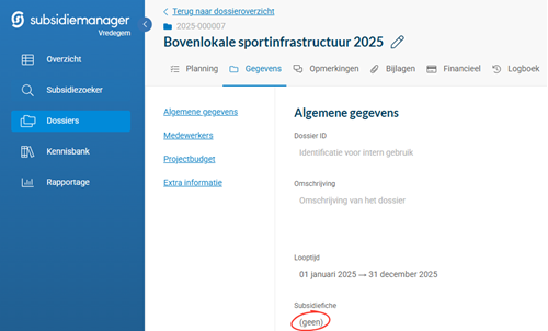 • De gewenste subsidie terugvinden door te klikken op (geen) onder subsidiefiche.