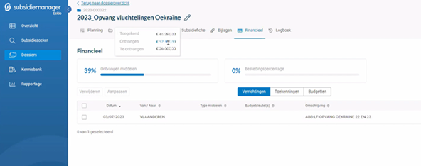 Het minimum dat wij vragen om er in te steken is het bedrag dat wordt toegekend. En dan is het zo dat ze vanuit de boekhouding bij ons invullen wat er effectief is uitbetaald. Dus in dit geval voor Oekraïne is het zo dat er heel summier wordt gewerkt. Bij de toekenningen wordt er ingestoken wat we vorig jaar mochten verwachten aan subsidies. En bij verrichtingen is het zo dat de boekhouding dit invult. En dan zie je dat de eerste schijf is ingegeven. Zo zie je ook hoeveel procent we hebben ontvangen.