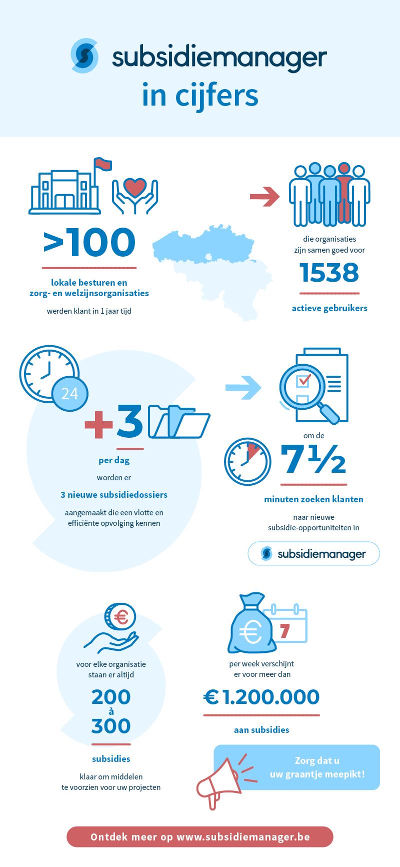 Waarom kiezen voor Subsidiemanager? Onze cijfers tonen aan dat Subsidiemanager voor heel wat organisaties de weg openlegt naar een efficiënt subsidiebeleid. De toepassing stelt u in staat om vlot subsidies te vinden en dossiers te beheren. Bovendien verwerft u inzicht in het grotere plaatje door middel van onze geautomatiseerde rapportage. Hadden we trouwens al gezegd dat er heel wat informatie te rapen valt in onze kennisbank? Ontdek hieronder alle cijfers!